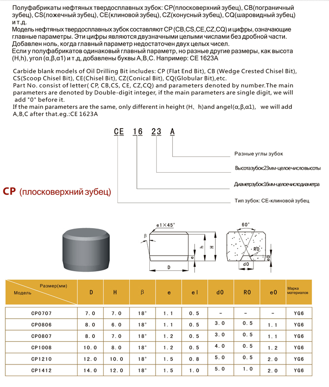 Нефтяные твердосплавные зубки  CP  (плосковерхний зубец)