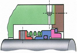 The mechanical seasl shown in above is a simple light-duty design. The sealing interface where the seal rotating and stationary faces make rotational contact is a plane annulus. The sealing faces themselves are lapped to a very high degree of flatness, measured in wavelengths of light. The body of the rotating component of the mechanical seal is free to float axially. This enables hydraulic pressure to keep the main sealing faces together in operation; in the absence of hydraulic pressure the spring serves the same purpose The closing force on the seal is designed to provide an acceptable compromise between leakage and wear. It must also be sufficient to prevent the faces from separating in the event of mechanical shock or a pressure fluctuation. A secondary seal prevents leakage between the floating assembly and the shaft; often a rubber `O' ring is used for this purpose.